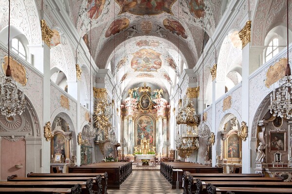 Nach einem Brand von 1723 wurden Wände und Gewölbe mit reichem Stuckdekor und Deckenmalereien ausgestattet. Erst 1928 entstanden die von Suitbert Lobisser an die Chorwände gemalten Szenen der Apostelfürsten Petrus und Paulus. Die Seitenaltäre ließ man nach dem Brand durch die Werkstatt Lukas Mislj aus Laibach in kunstvoller Marmorzusammensetzung errichten. Unter den Altarblättern, die sie umrahmen, sei in der Christuskapelle jenes der Vision des hl. Ignatius von Paul Troger aus dem Jahr 1727 gesondert hervorgehoben. Den Höhepunkt der Ausstattung stellt der 1752 in Holz errichtete und mit kunstvollem Stuckmarmor versehene Hochaltar dar. Zwei weitere künstlerische Glanzpunkte der hochbarocken Ausstattung sind die Kanzel von 1726 und die plastische Gruppe der Apotheose des hl. Nepomuk nach einem Entwurf von J. F. Fromiller.