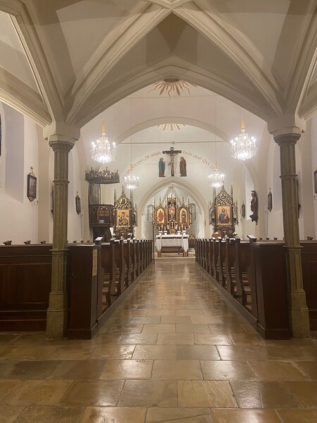 Die Ursprünge der Pfarre reichen bis um 1300 zurück. Nach Zerstörungen im 17. Jahrhundert wurde die dem Hl. Georg geweihte Kirche mehrmals wiederaufgebaut und 1865 im neoromanischen Stil erweitert. Vor zwei Jahren wurde der Innenraum generalsaniert und erstrahlt seither in neuem Glanz. Auch das ganze Kunstinventar wurde renoviert, darunter Glasmalereien mit Darstellungen der vier Evangelisten und eine Statue des Hl. Georg am Hochaltar.