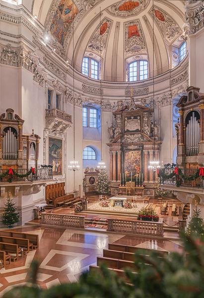 beherrscht mit seiner markanten, zweitürmigen Fassade und dem mächtigen Baukörper das Bild der Altstadt von Salzburg. Die barocken Plätze, die ihn umgeben, formen eine einzigartige Bühne, die von den Festspielen genutzt und von der UNESCO als Weltkulturerbe gewürdigt wird.