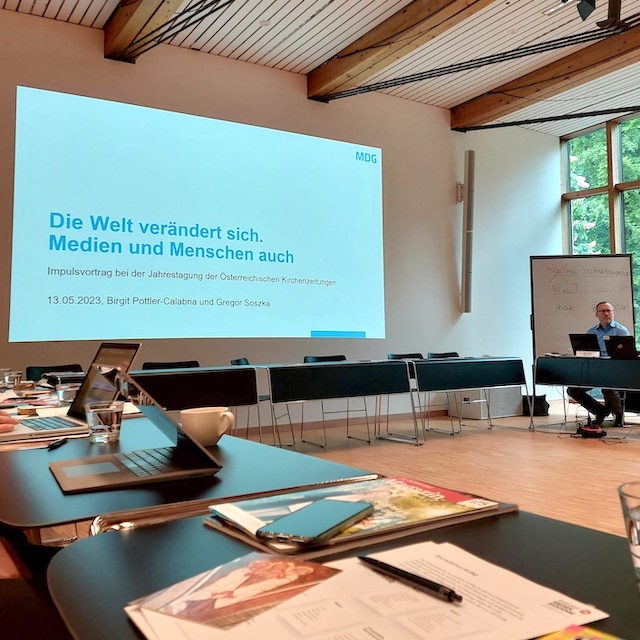 WORKSHOP für die Mitarbeiter:innen der Kirchenzeitungen im Rahmen der Kirchenpresse-Konferenz. Referenten: Birgit Pottler-Calabria und Gregor Soszka (MDG München)